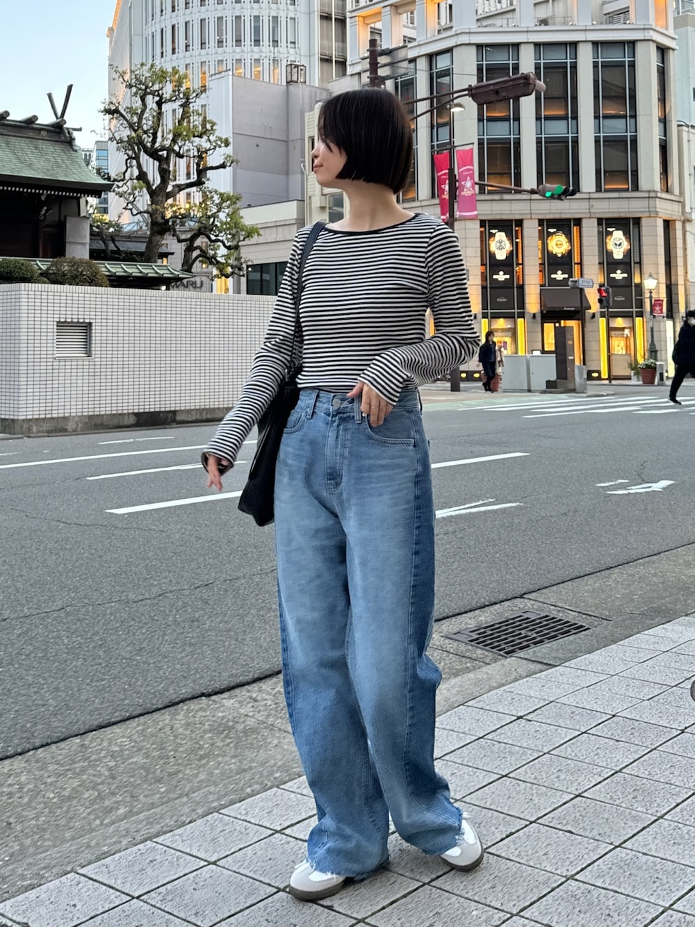 暖かくなったら着たいと思っていたボーダーロンTと新作のデニム👖♡ ロンTはボートネック仕様で首周りを自然と綺麗に見せてくれて、カジュアルなボーダーデザインも大人っぽく着ることができます😊✨