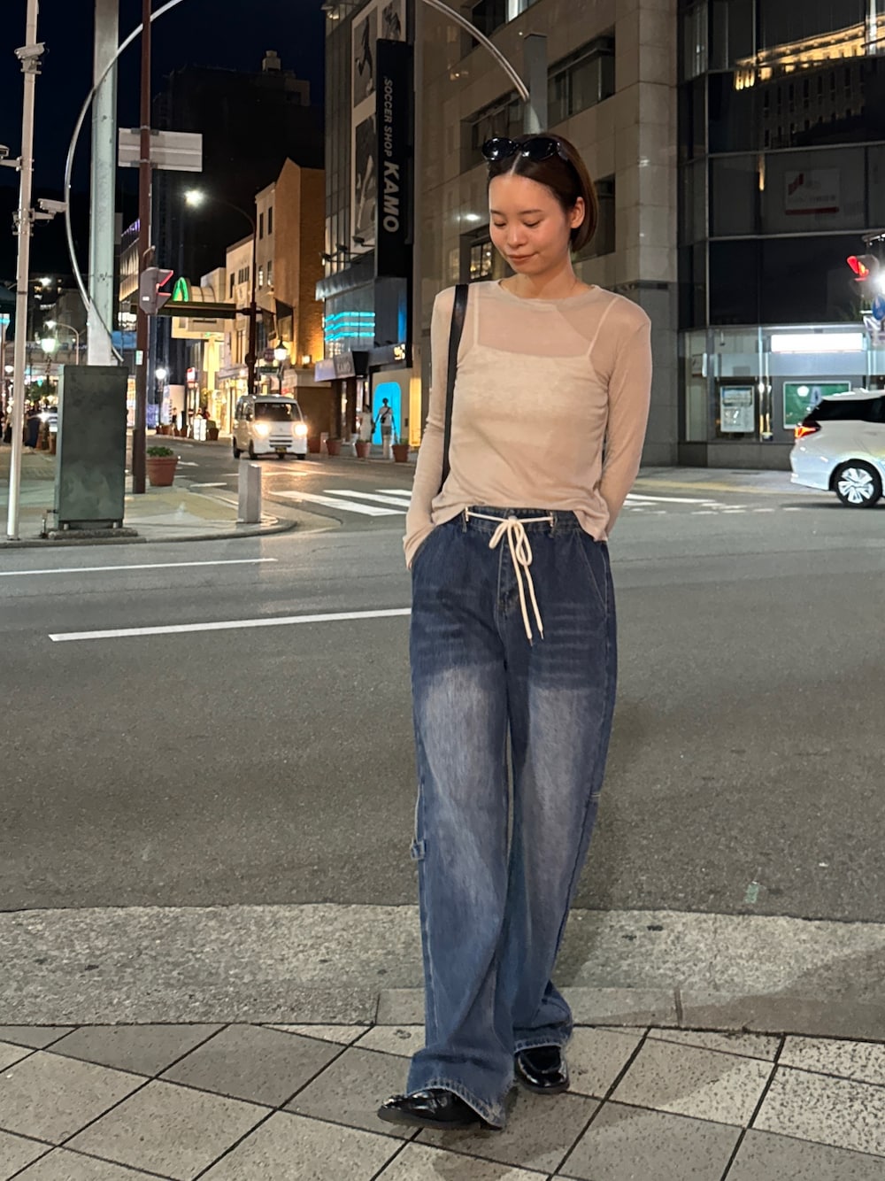 シアーロンTと新作の紐付きデニム👖♡ シアーロンTはインナーをショート丈にすると今の時期でも着やすくておすすめ☺️ デニムは秋らしいカラーとウエストの紐がアクセントになっていてシンプルなトップスとコーデしやすいアイテムです🍂
