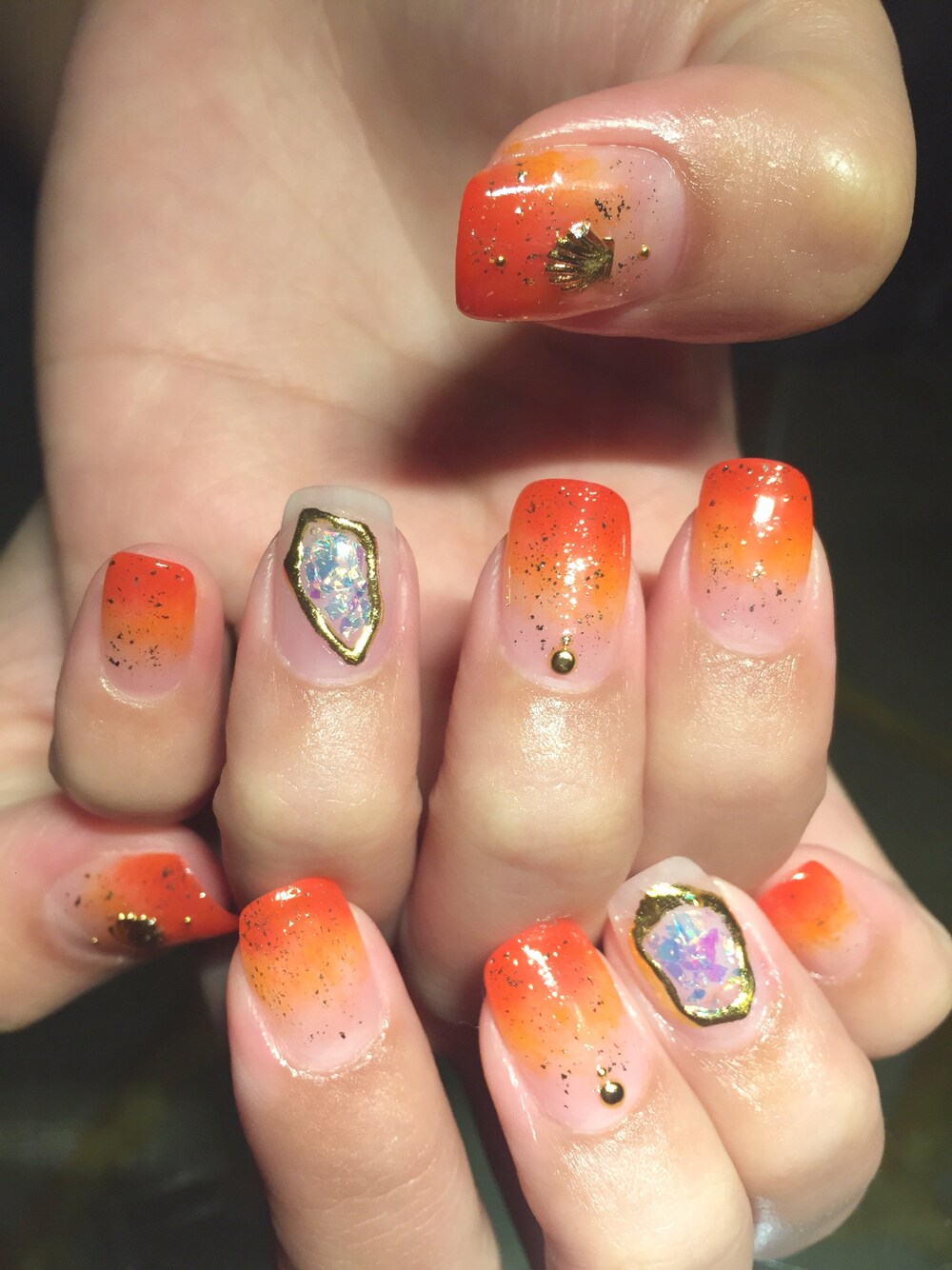 Friend's nail:オレンジ×朱色のグラデーションネイル💅🏻✨ 赤オレンジ2色のグラデーションに、金箔ラメを散らして、スタッズを乗せました⭐️ 両薬指はゴールドの変形枠シールに乱切りホロを敷き詰めました👌💓 夏っぽくて可愛いです💓