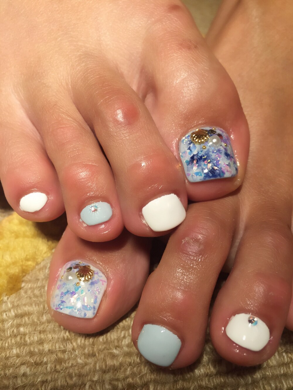 Friend's nail:ブルーと乱切りホロの夏フットネイル💅🏻✨ 親指はそれそれホワイトベース、ブルーベースでタイダイをつくって、その上に乱切りホロを乗せてキラキラに⭐️ シェルやストーンでさらに夏っぽくしました💓