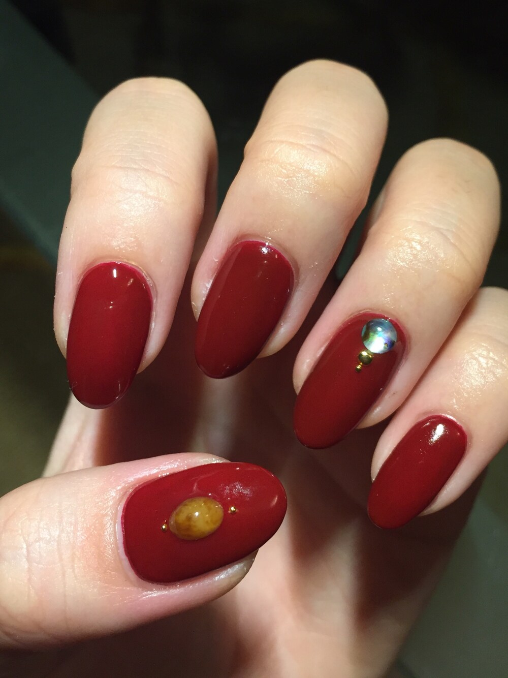 My nail:ダークレッド×ストーンのシンプルネイル💅🏻✨ 旅行前にまた変えるので2週間だけのシンプルネイル⭐️意外にもスクール生時代の練習でしかやったことない赤のワンカラーに、薬指と親指にそれぞれ違うストーンを乗せて大人っぽくしました💓 色は秋っぽいですが(笑) 次の休みで着る浴衣に合わせました✨
