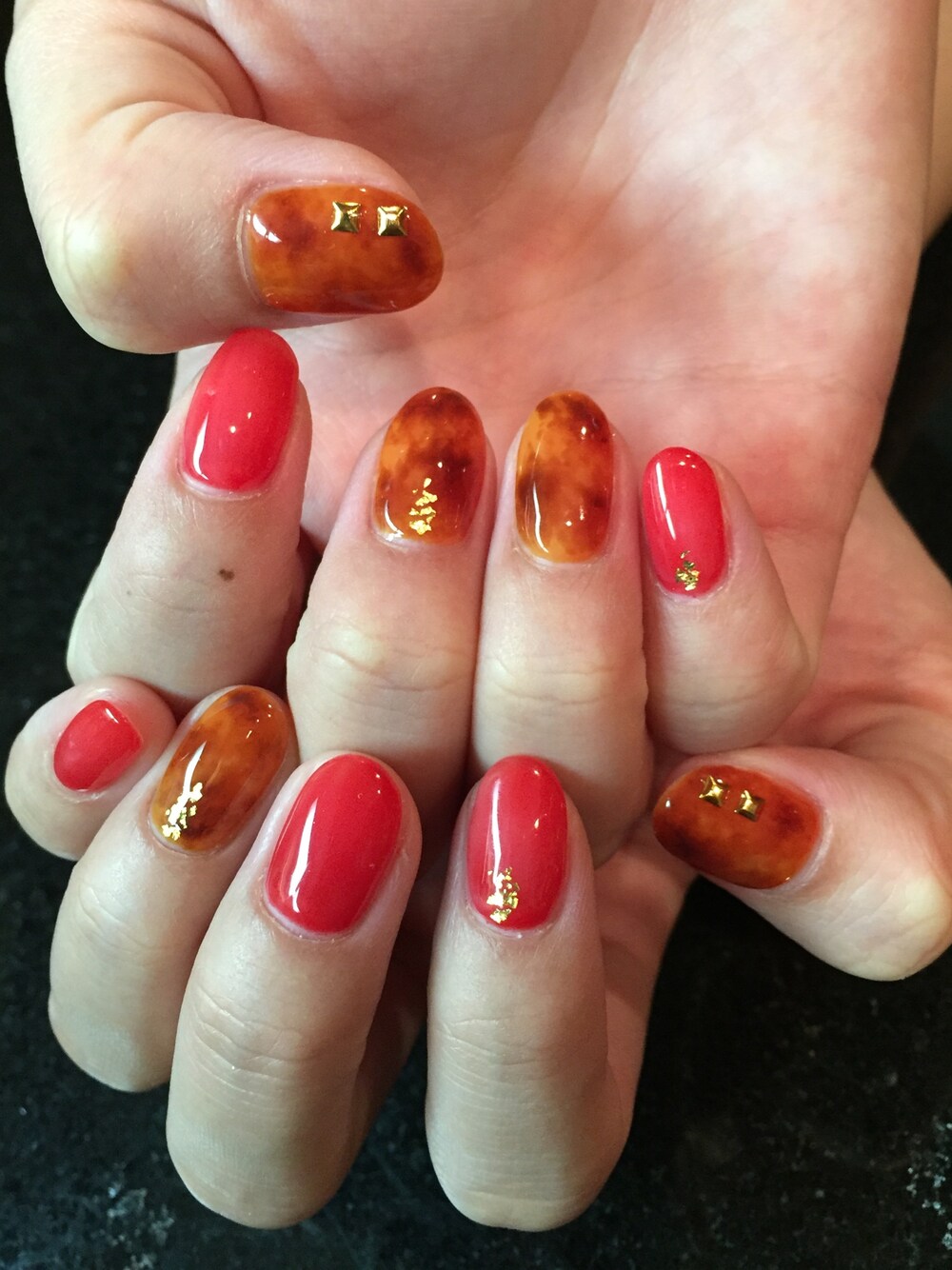Friend's nail:べっ甲×赤の透け感ネイル💅🏻✨ 私のをみてやりたいって言ってくれました💓 べっ甲以外は赤の透け感のあるジェルにしたのですごく可愛いです💓