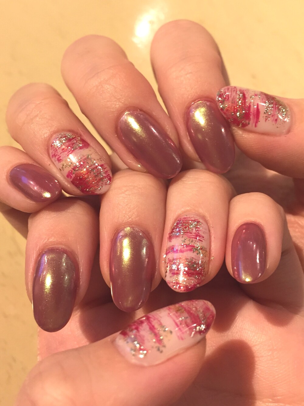 My nail:秋色ミラーネイル×ぬりかけネイル💅🏻⭐️ 秋らしい色のオーロラミラーネイルに、足とお揃いで塗りかけアートも入れました💓 ミラーネイル、男ウケ悪そうですがとてもタイプです💓(笑)