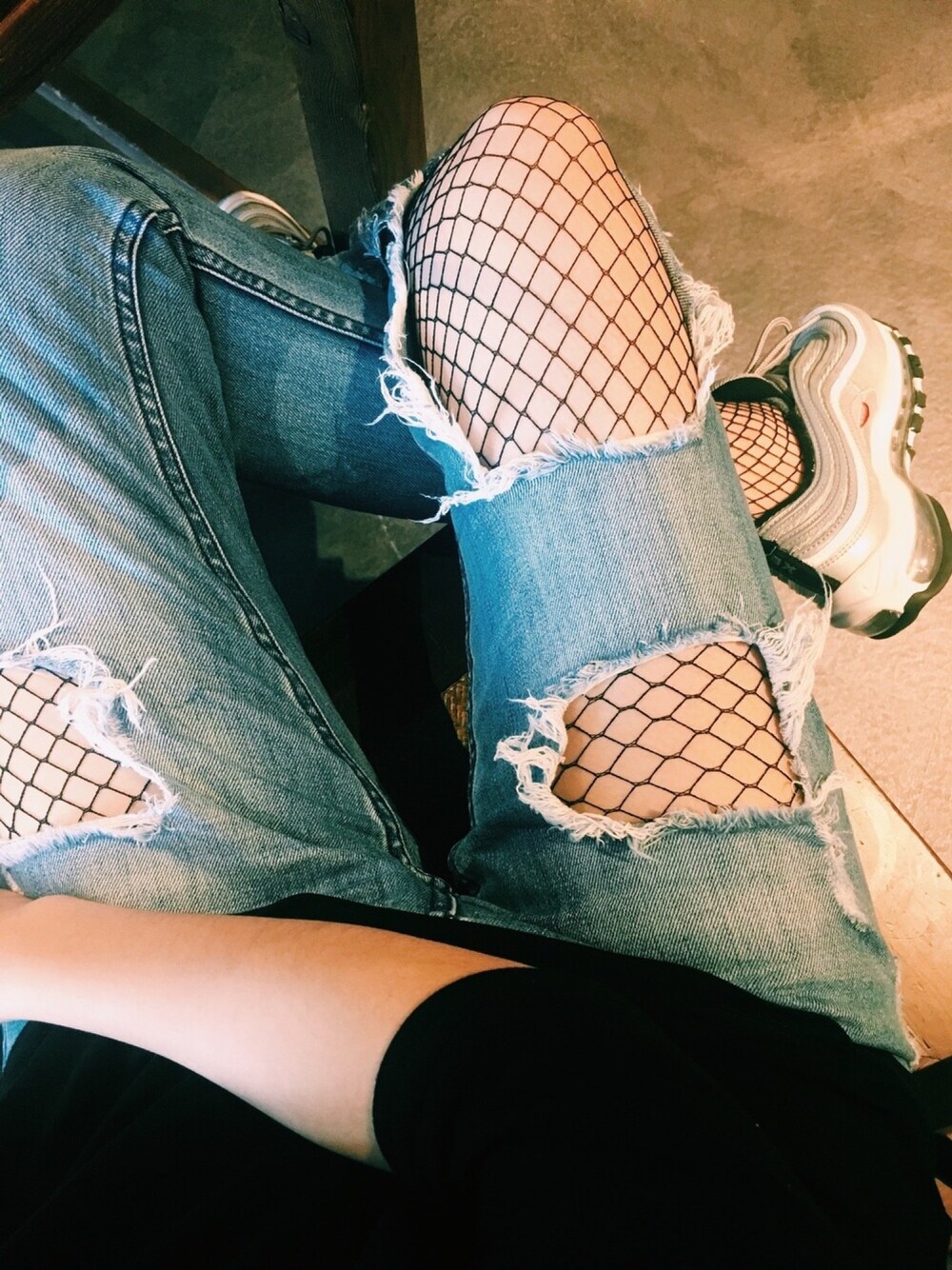 ブルー系のデニムパンツ、シルバー系のスニーカーを着用したレディースの春コーディネートの1枚目の写真