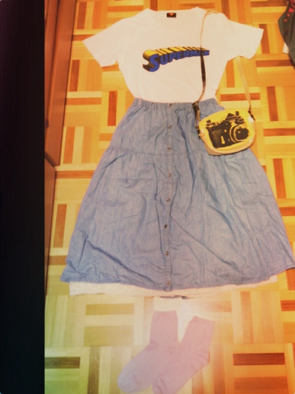\シンプル個性コーデ/ 黄色と青系でまとめたシンプルなコーデに印象的なスーパーマンのロゴとカメラデザインのバッグで少し個性をだしました♪ 公園でのんびりしたいです(^○^)🍀 BAG:古着屋さん