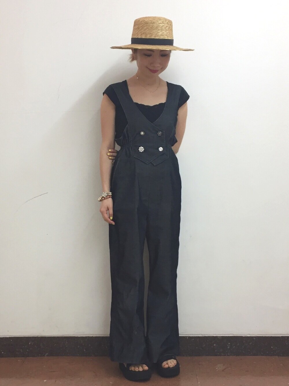 カジュアルなイメージがあるデニムサロペットは、キャミソールやジュエリーでバランスを取りました。