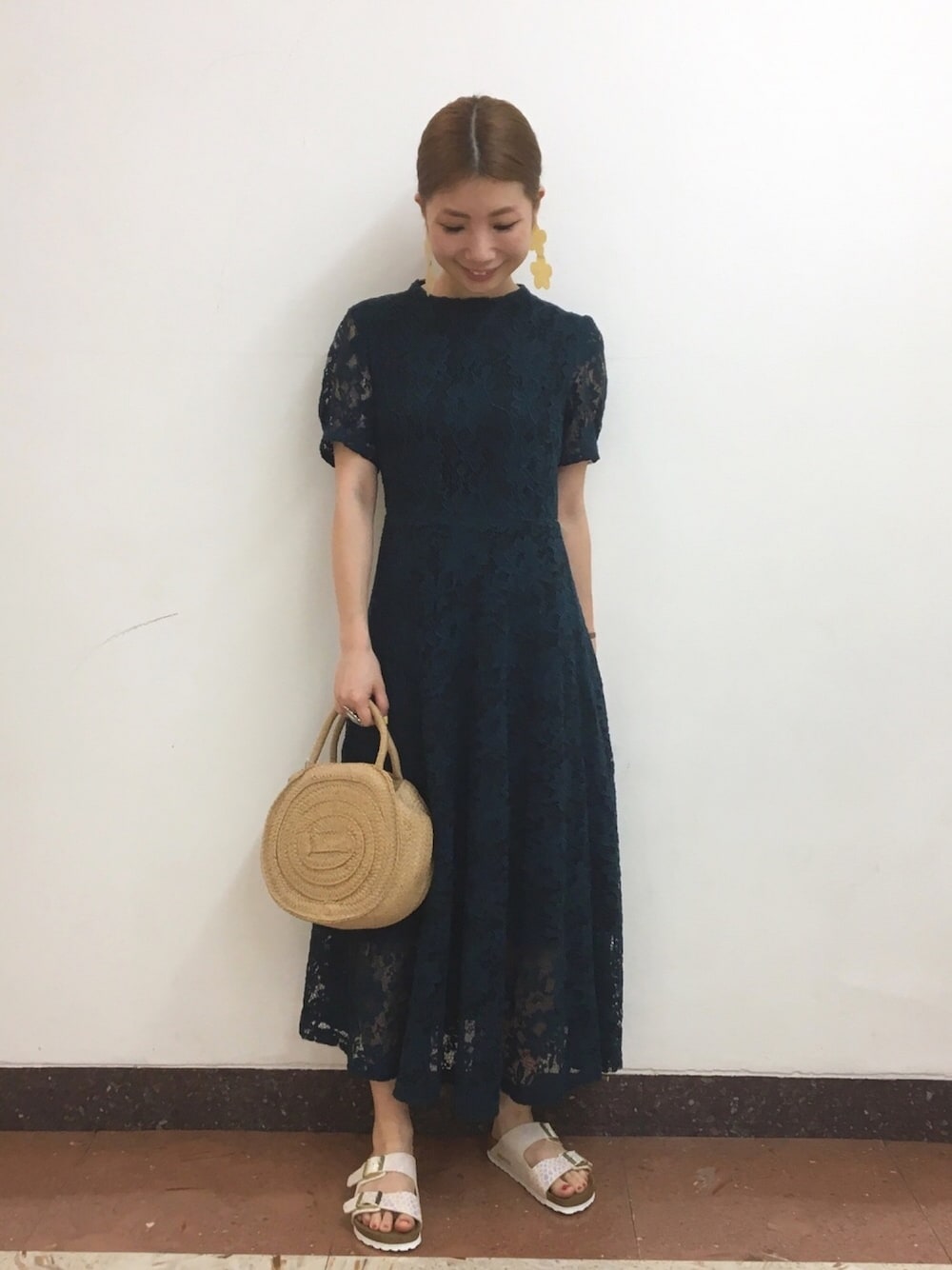 夏日にぴったりなワンピースとピアス。 今日はサンダルとバッグでカジュアルダウンさせました。