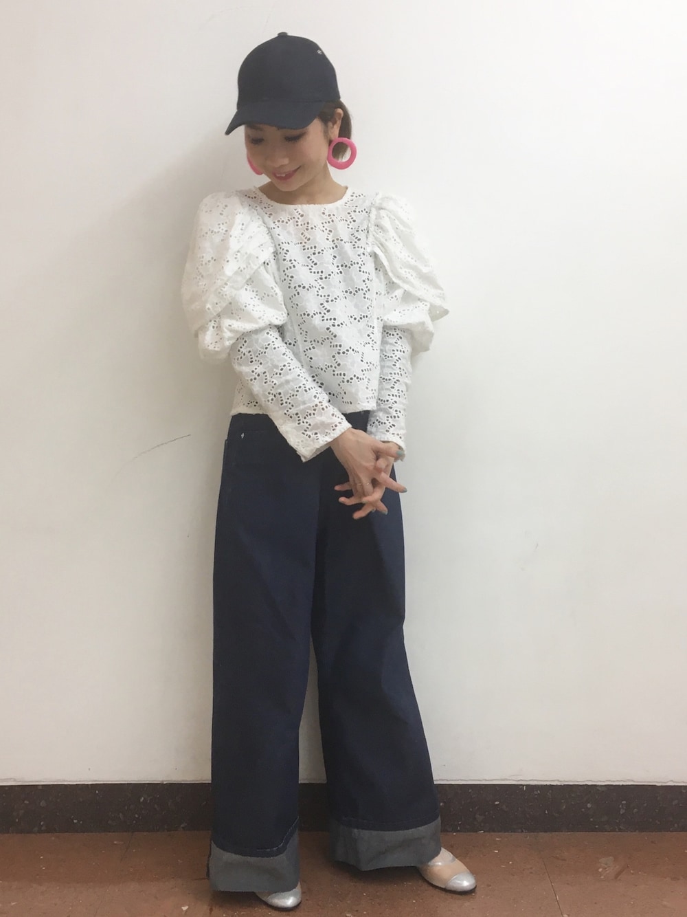 キャップとデニムパンツの色を統一し、ピアスとシューズをポイントにしました。