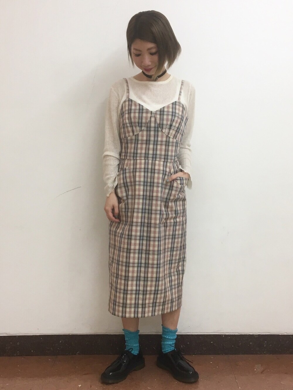 〈ISA AFEN〉のワンピースは小物次第で様々なスタイルが楽しめます。今日はチョーカーやブルーのソックスでカジュアルに。