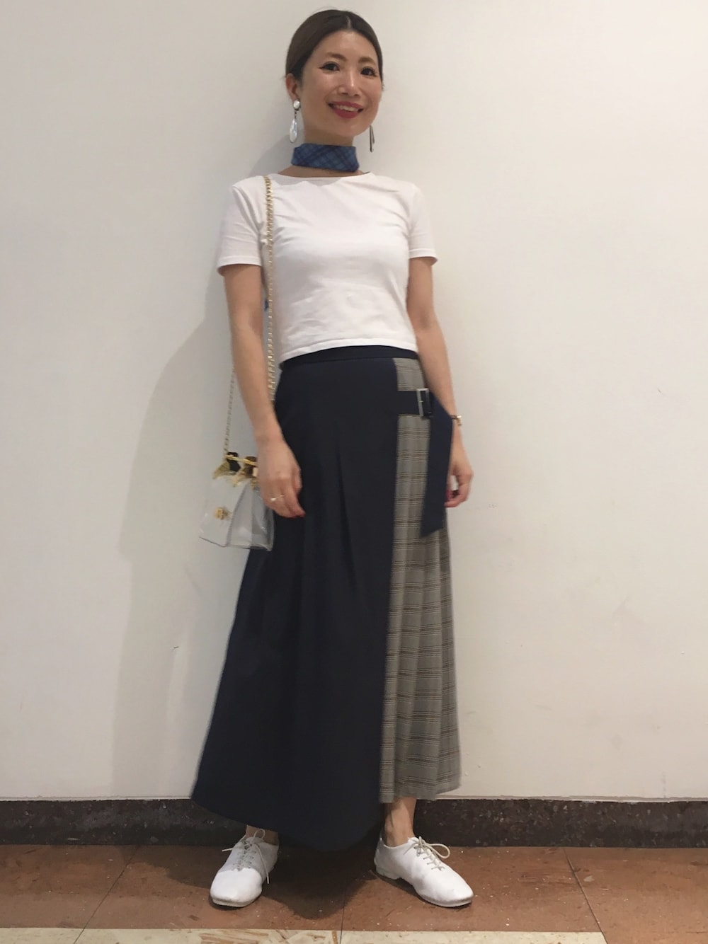 チェック柄をポイントに置いたスタイリング。トレンド要素はバッグで。