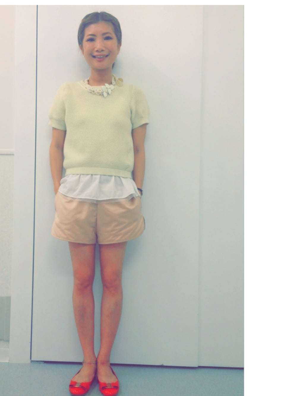 ピンク×赤の組合せ、好きです ネックレスは、服を傷つけない素材なので大重宝 トップス:Ray BEAMS タンクトップ:Ray BEAMS パンツ:T ALEXANDER WANG シューズ:SALVATOLE FERRAGAMO ネックレス:アトリエ染花