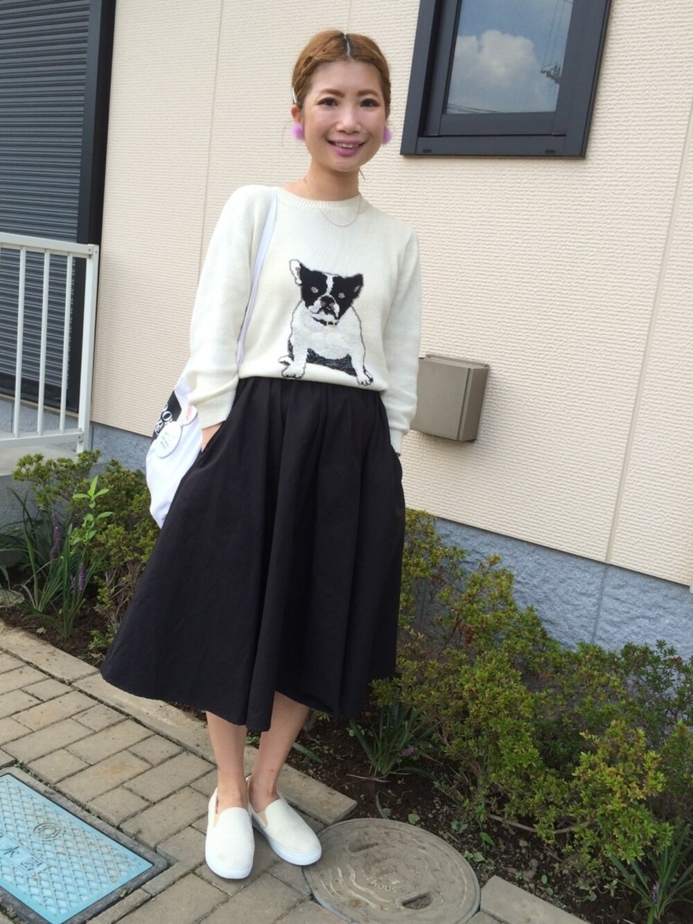 フレンチブルドッグ柄のトップスはbeautifulpeople。 スカートはRay BEAMS。 ピアスはピンクに続き、ラベンダーを購入しました