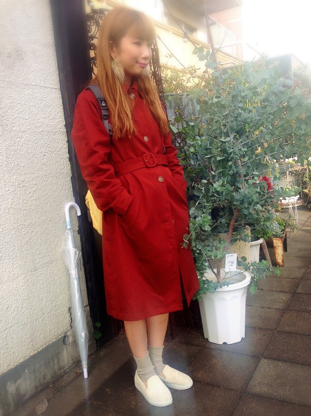 雨上がりの近所散歩に、スリッポン。 スリッポンは3色ありますが、、 APCのレンガ色コートにはオフホワイトを選びます。