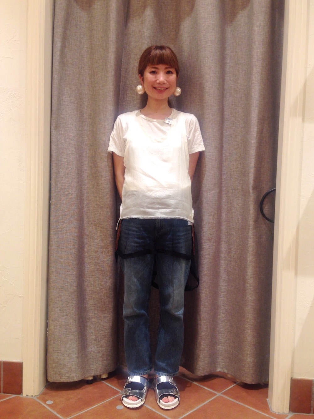 HanesのTシャツとTOGAのサテン地タンクトップを重ね着しています。 服は白でまとめてサンダルはシルバーにしました。