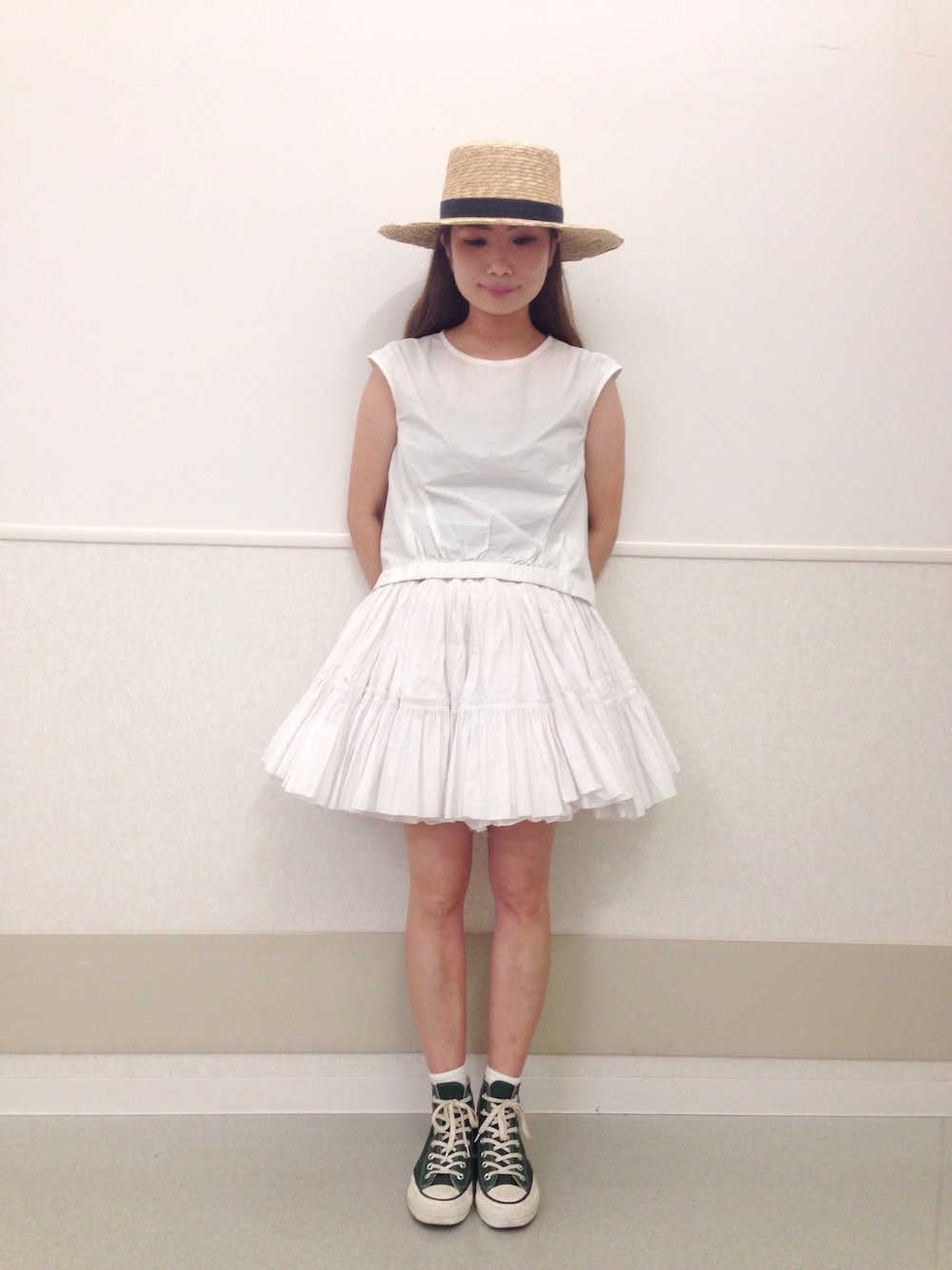 大きなブリムが特徴のカンカン帽子はJanessaLeone。 白で統一したシンプルなスタイリングなので小物を楽しみました。 CONVERSE ALL STARはBEAMS BOYで昔、見つけたもの。 深緑色が気に入っています。
