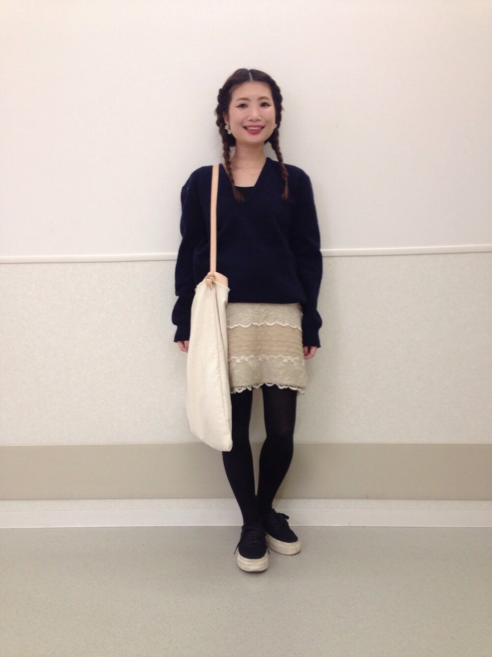 ネイビー×ブラック… 最近はやはりこういった色味が落ち着きます 【セーター】BEAMS BOY 【スカート】sacai 【バッグ】specialty dry goods(Ray BEAMS) 【シューズ】Eytys