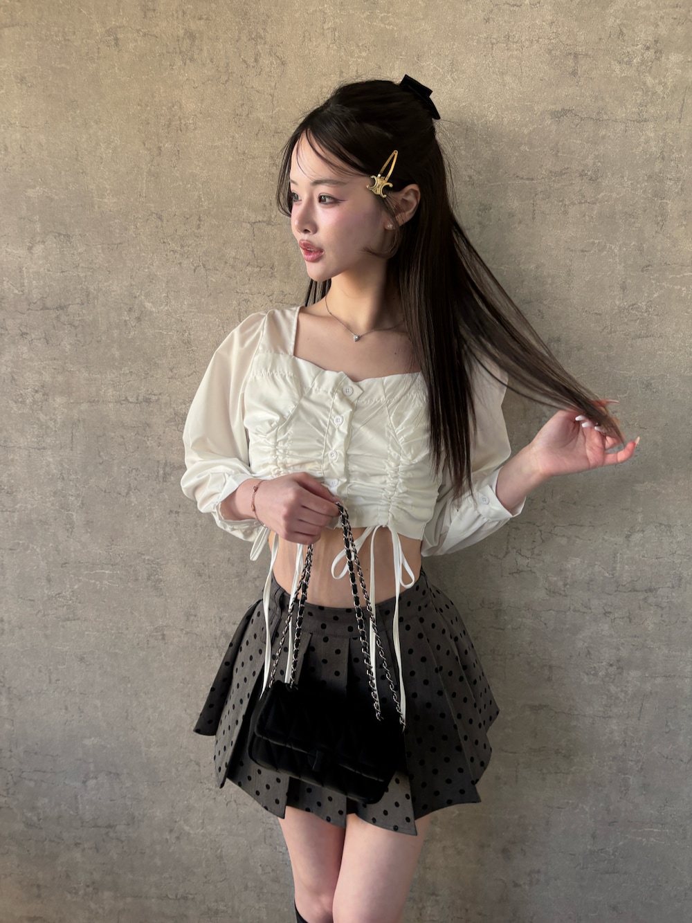 ドロストブラウスでコンパクトにまとめつつ フレアミニでシルエットにメリハリをཐིཋྀ⋆ 甘さのあるドットスカートも大人っぽく仕上げました🖤