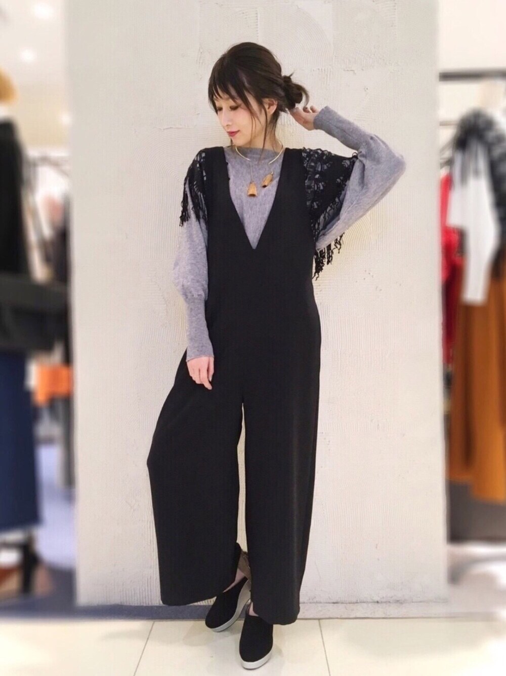 オールインワンの着回し☆ シンプルになりがちなインナーにも、 デコラティブなレース&フリンジがインパクト大!なニットをイン。