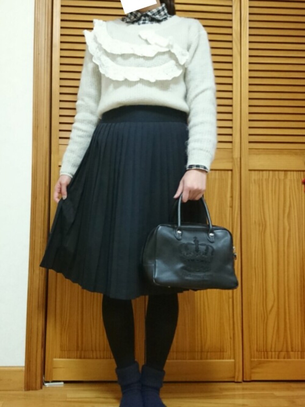 紺のプリーツは合わせやすくてお気に入りです😊 制服ぽくて可愛いです... 久しぶりにメタモのハンドバッグを使いました🎵 これまた万能でお気に入りです。