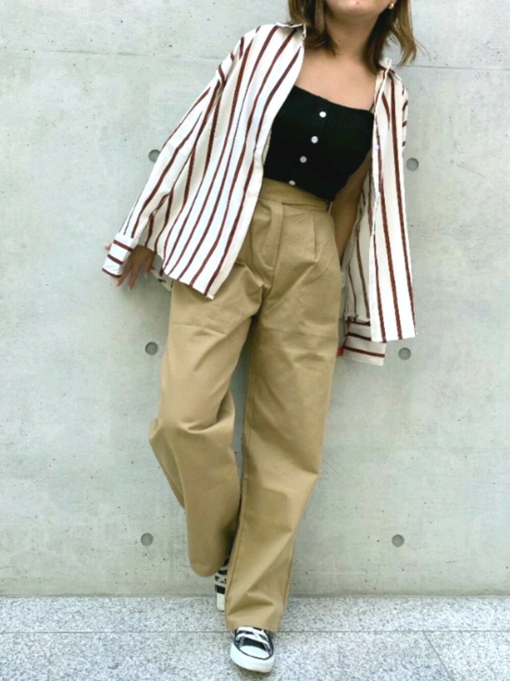 ハイウエストのタックチノで スタイルアップ🔥 シャツもサラっと羽織って 朝晩の気温調整もばっちり👌💓