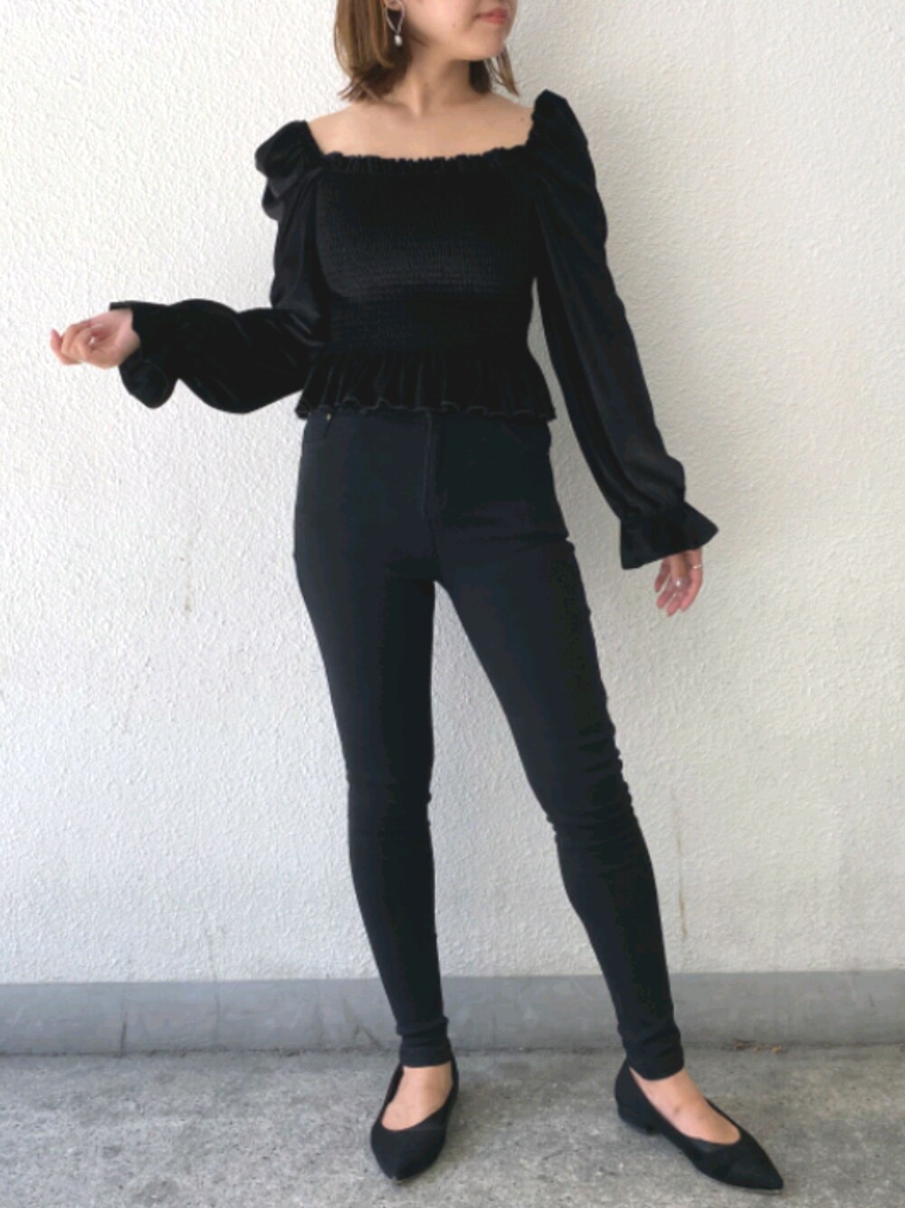 ベロアのトップスは スクエアネック・オフショルの 2wayで着回せます🙆 ボトムスやアウターに合わせて 変えられる万能アイテム。