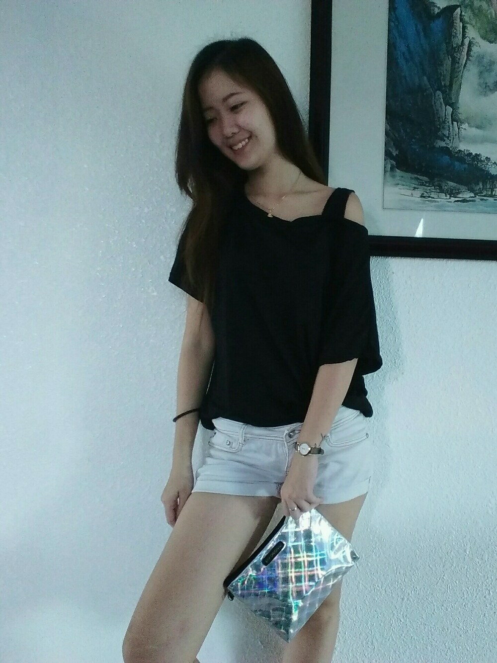 ブラック系のトップスを着用したレディースの夏コーディネートの1枚目の写真