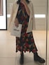 ((表参道徘徊コーデ 柄の強めなワンピースには黒バックに黒ブーツで重めに締める💞 白のジャケットを持ってくる事で上品な女性に仕上ります