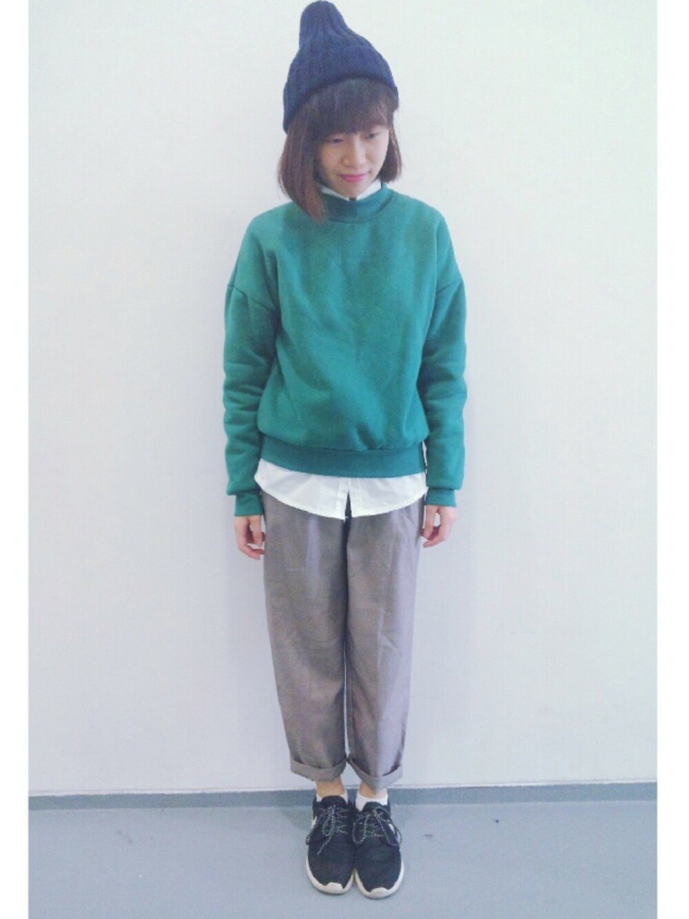 ブラック系のスニーカーを着用したレディースの冬コーディネートの1枚目の写真