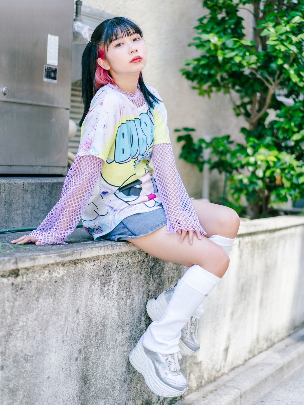 Tシャツ×派手色ネットトップス 厚底スニーカー×レッグウォーマー は最強の組み合わせ❣️