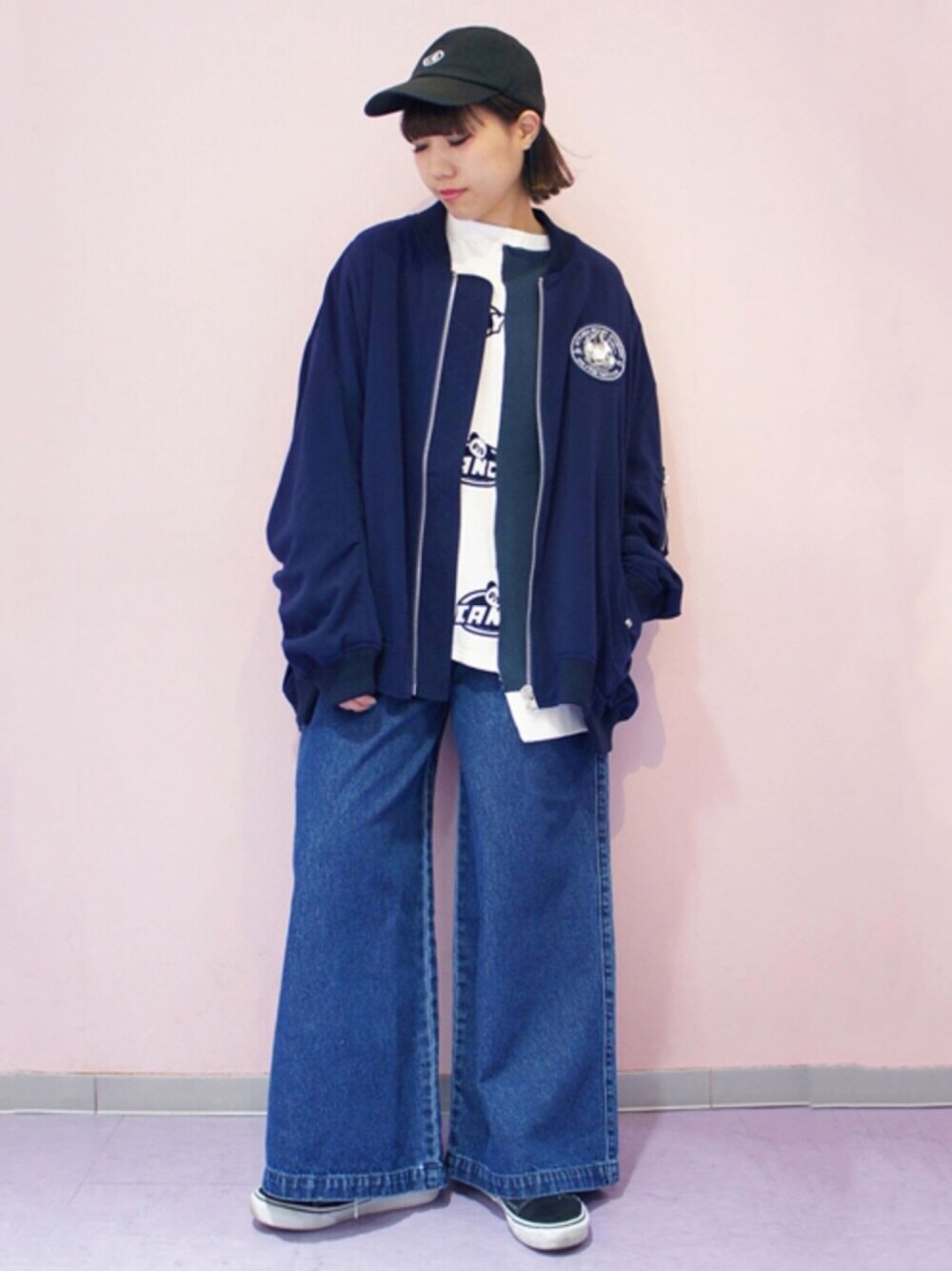 2枚のMA-1をレイヤードしたようなデザインのジャケット。ストリートなスタイルで着こなしたい、オーバーサイズでルーズなシルエットが魅力。胸もとにはCATモチーフのワッペン付き。