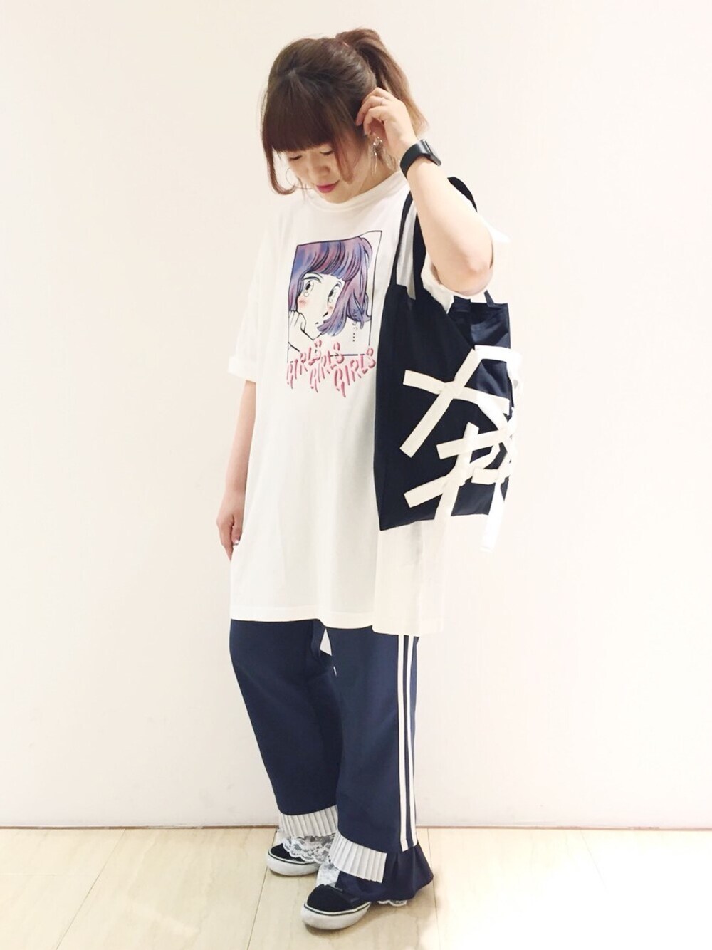 少女マンガのようなグラフィックがプリントされた、ルーズなシルエットのBIG Tシャツです。 ロールアップされた袖口がこなれ感を演出! 肌馴染みの良いコットン素材で着心地も良く、 ゆるっとワンピース風に着こなすこともできます。