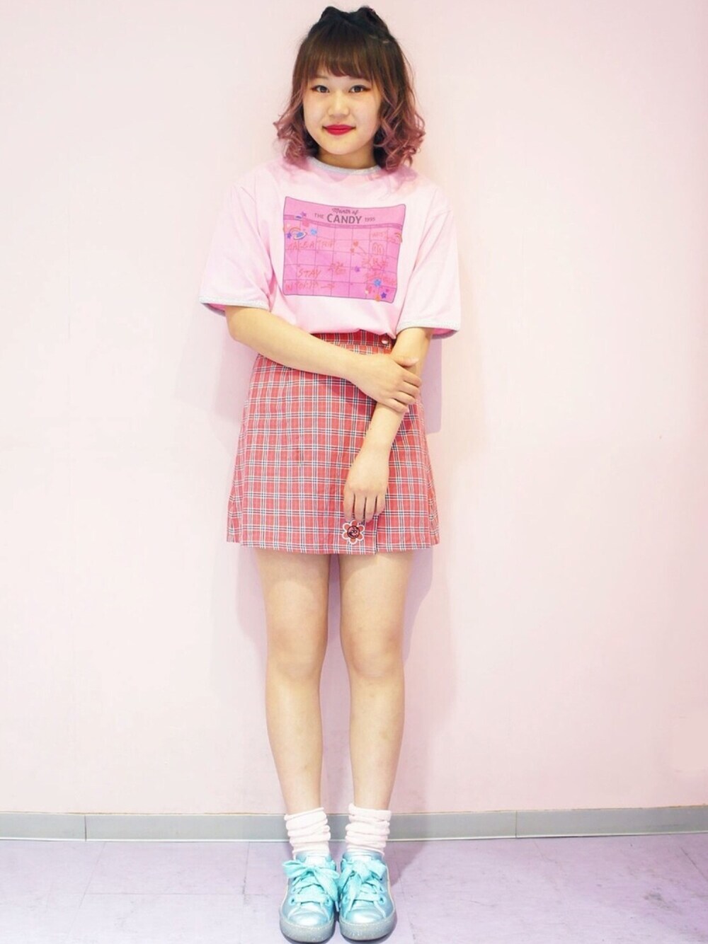 フロントにプリントされたカレンダーのグラフィックが可愛い、ガーリーな印象のTシャツ。襟ぐりと袖口にはラメ素材のリブを配し、90sな雰囲気に仕立てました。