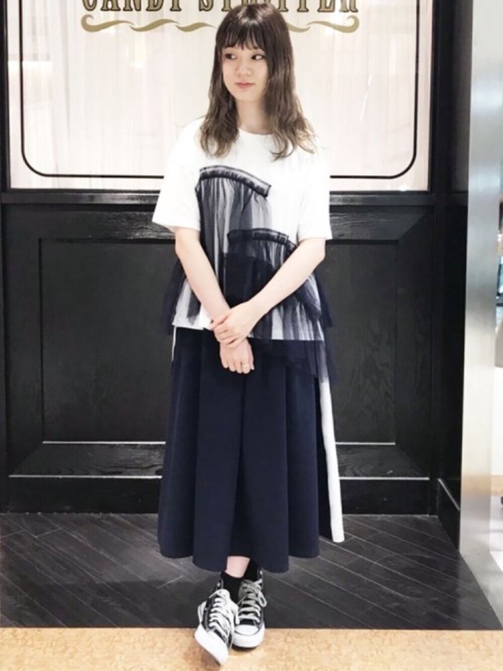 Tシャツの上にランダムにチュールのフリルをあしらったトップス。 ガーリースタイルはもちろん、ジャージなどスポーティなボトムとのMIXコーデもお楽しみいただけます。