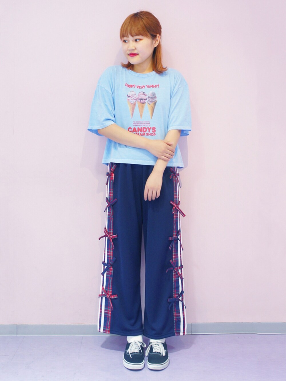 夏にぴったりなアイスクリームのグラフィックがプリントされたTシャツ。 トレンドのジャージパンツと合わせたスポーツMIXスタイル!
