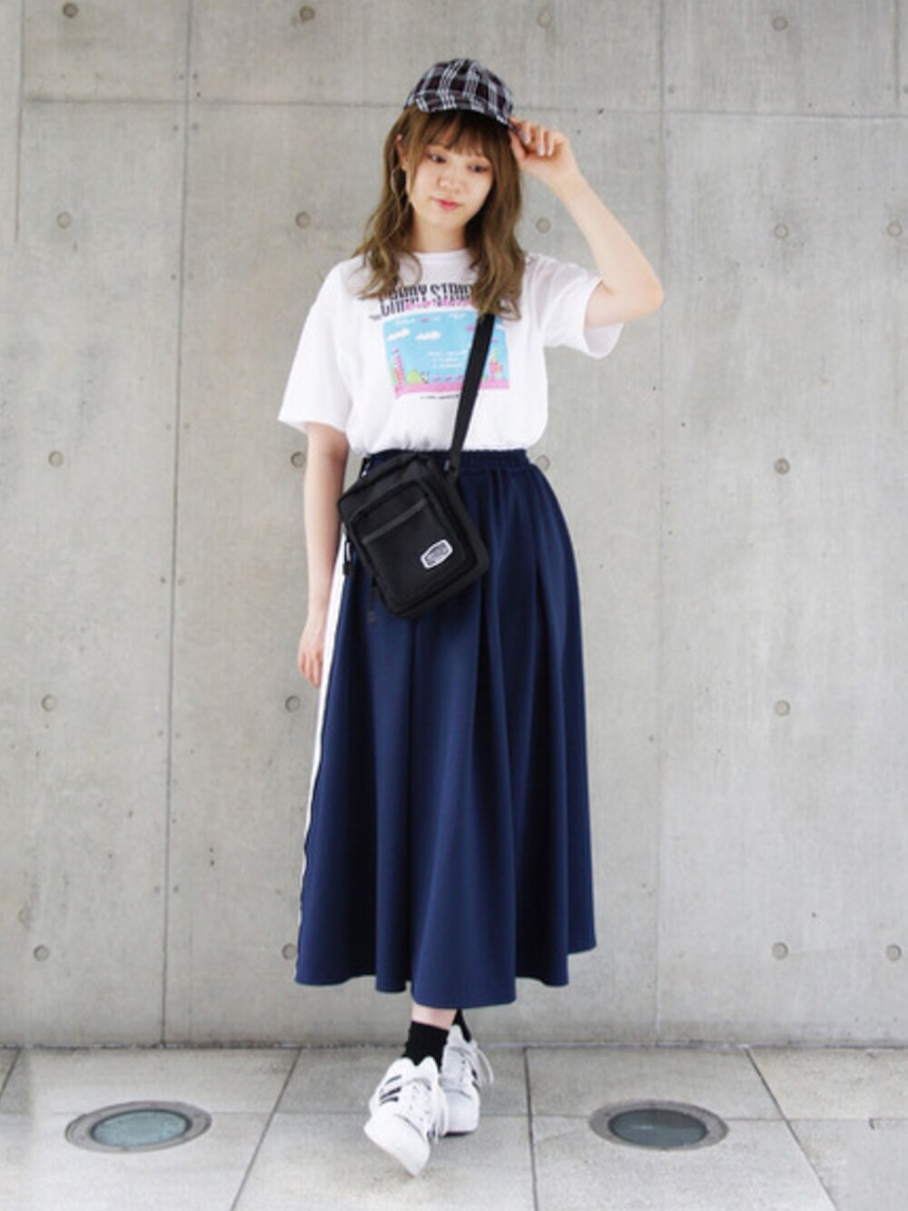 90sな雰囲気の漂うテレビゲームのグラフィックがプリントされたTシャツを主役に ジャージスカート+ショルダーバッグを合わせた アウトドアシーズンにおすすめのスポーティスタイル。