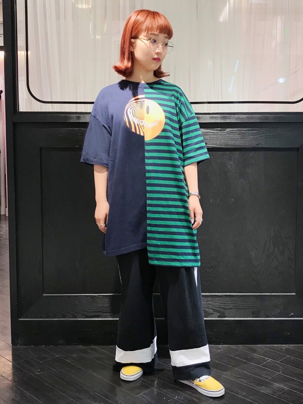 右は無地、左はボーダー柄で切り替えた、左右で丈も異なるリメイク風のワンピースです。 フロントにプリントされた、ボーダーの歪んだモチーフもポイント。