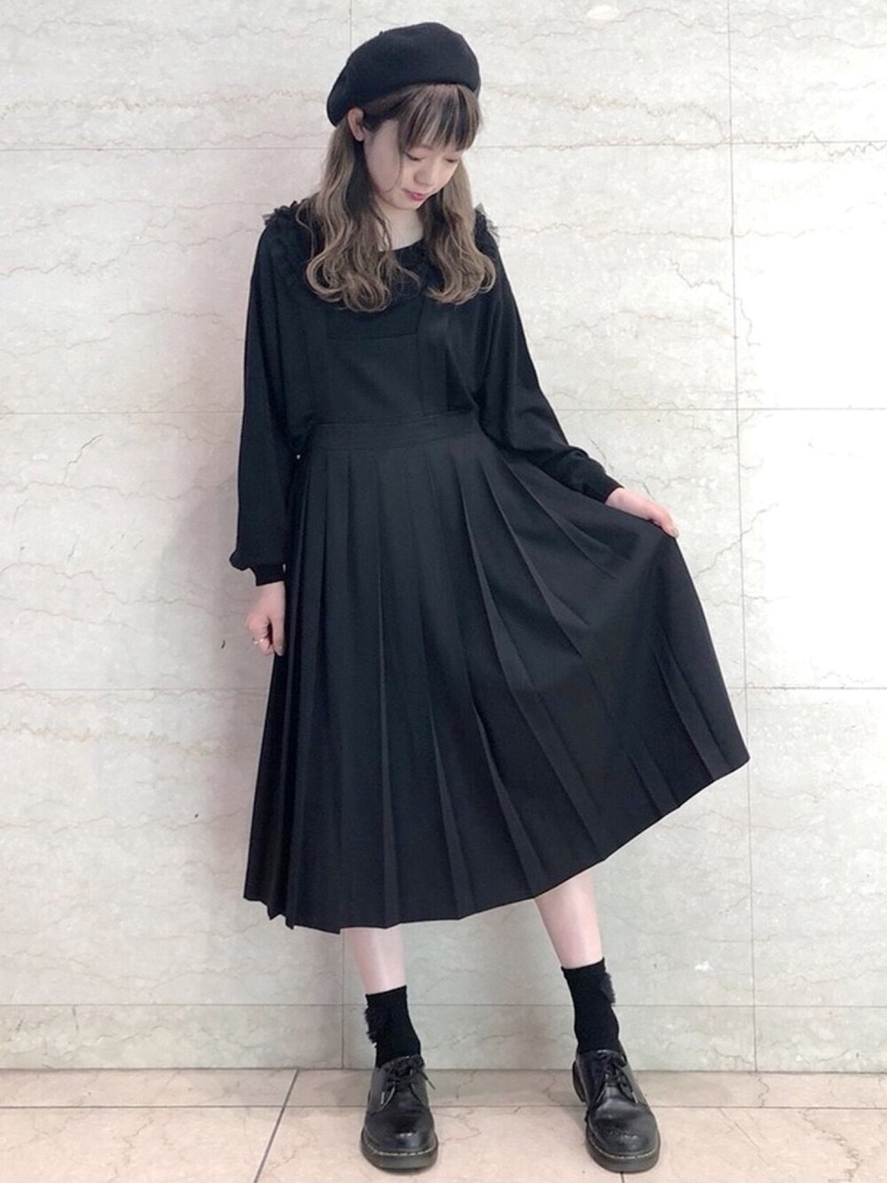 エプロンワンピースに襟付きニットを合わせてグッドガールなスタイルに。 あえてBLACKでまとめてシックに。