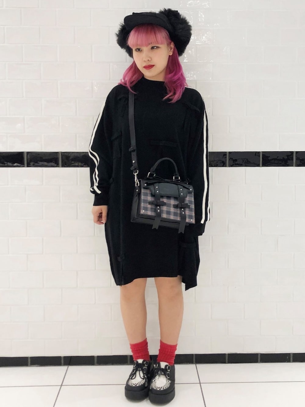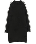 リボン結びを散りばめたニットワンピース。 ジャージのような袖のスポーティなラインで甘さを抑えた仕上がりに。