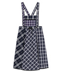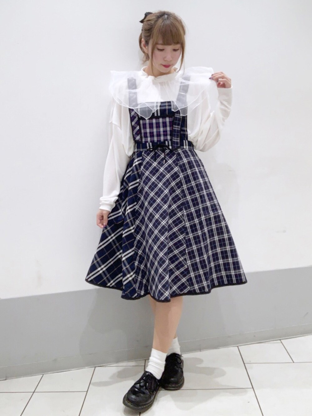 フリルカラーが特徴のトップスにエプロンワンピースを合わせてガーリーなコーディネートに。 存在感のあるチェック柄がコーデの主役に!