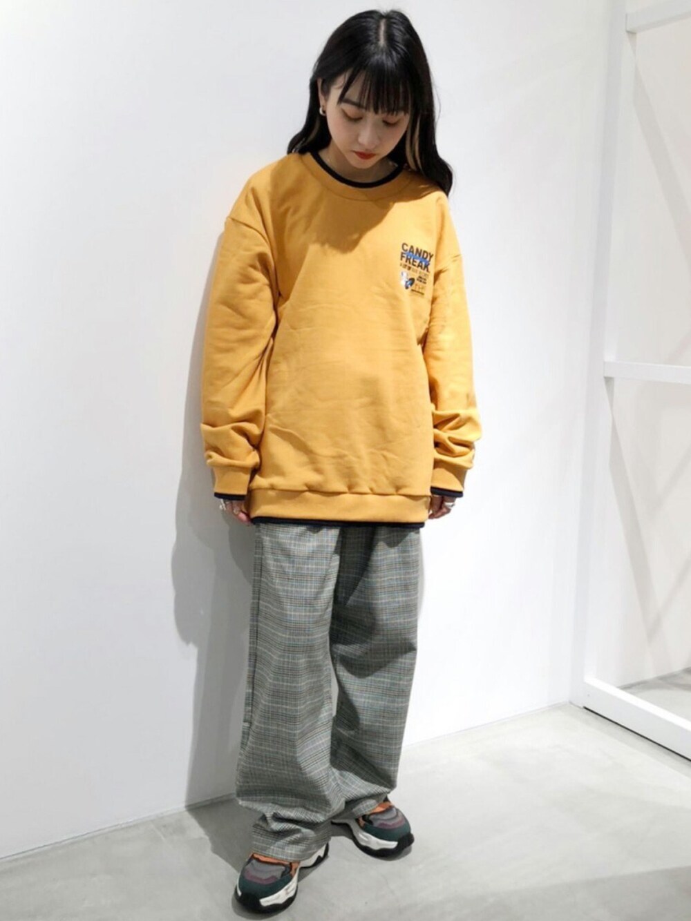 フライヤー風のグラフィックがポイントのトップスと、ゆったりシルエットのチェックパンツを組み合わせてボーイッシュなスタイルが気分♪