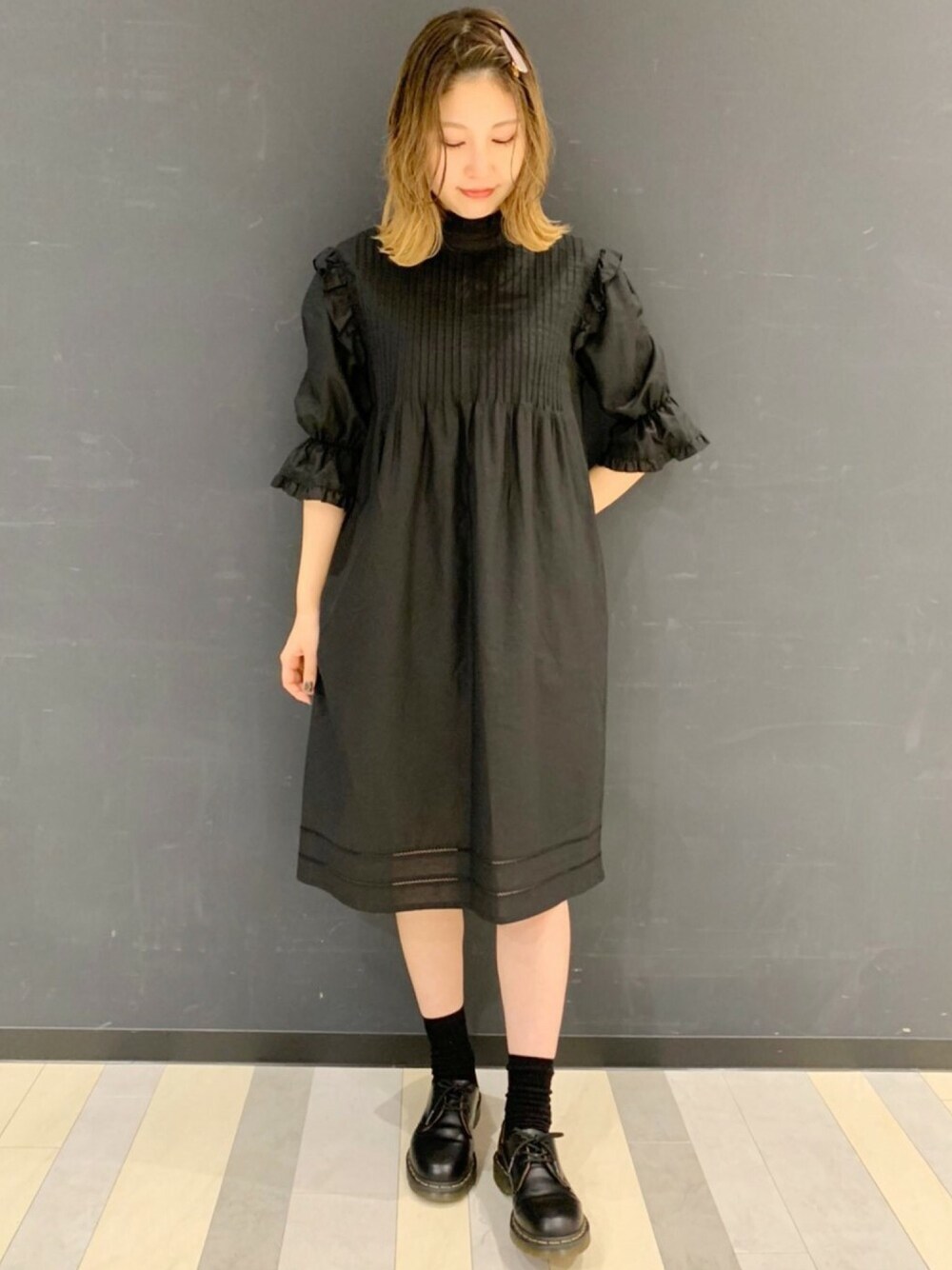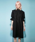 ピンタックやパフスリーブなどでティールに凝ったワンピースは一枚で決まるアイテム! 甘すぎないオールBLACKコーデ!