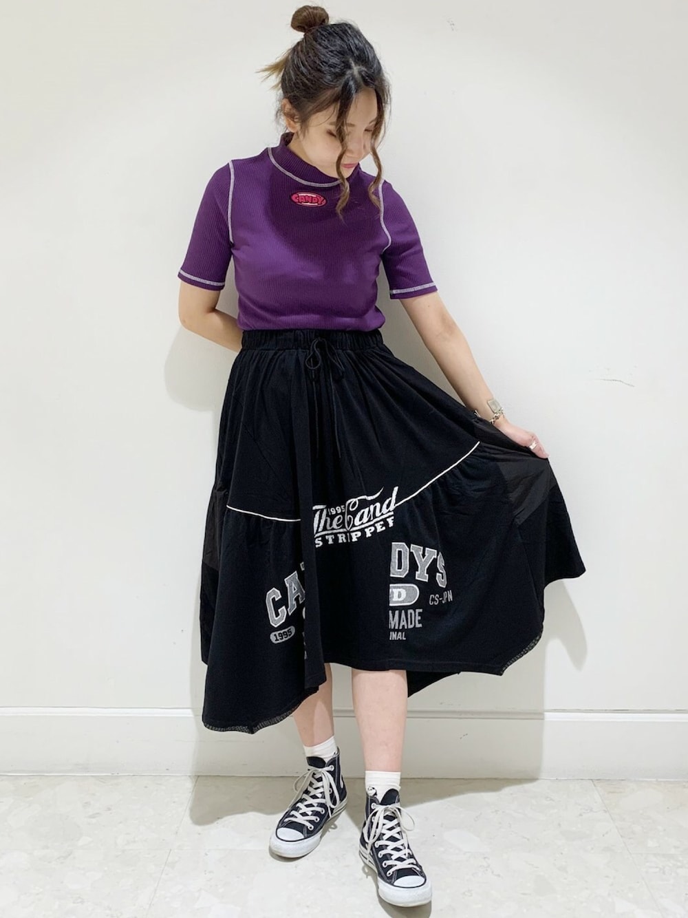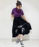 インパクトのあるデザインのリメイク風スカートはコーデに取り入れるだけでキマるアイテム!ビビッとなパープルのトップスも◎