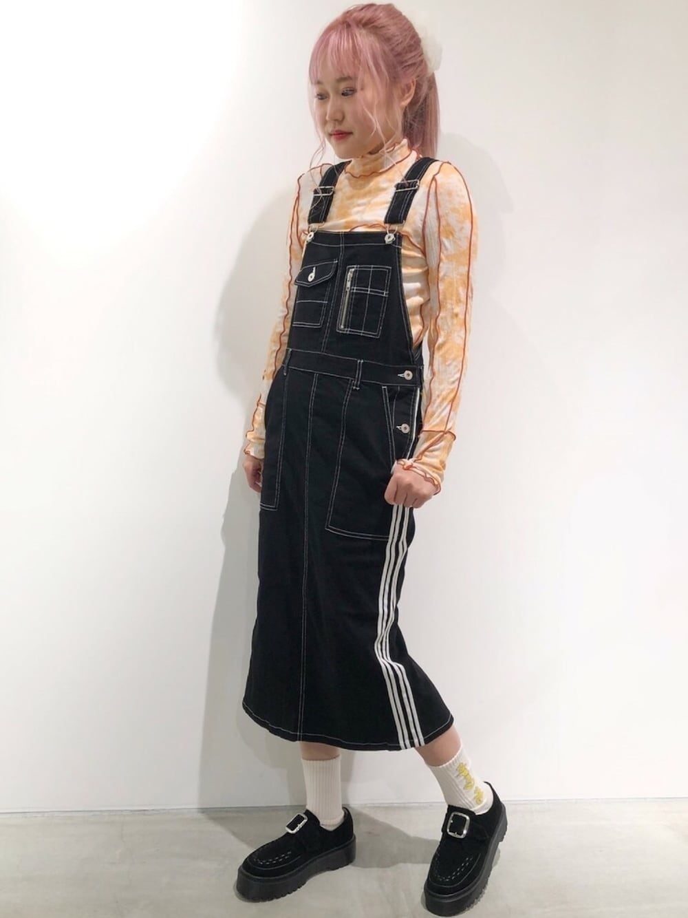 トレンド感のあるシアートップスにスポーティなジャンパースカートを合わせた 遊び心のある大人スタイリング♪ 足元はラバーソール風のシューズで大人っぽく。