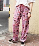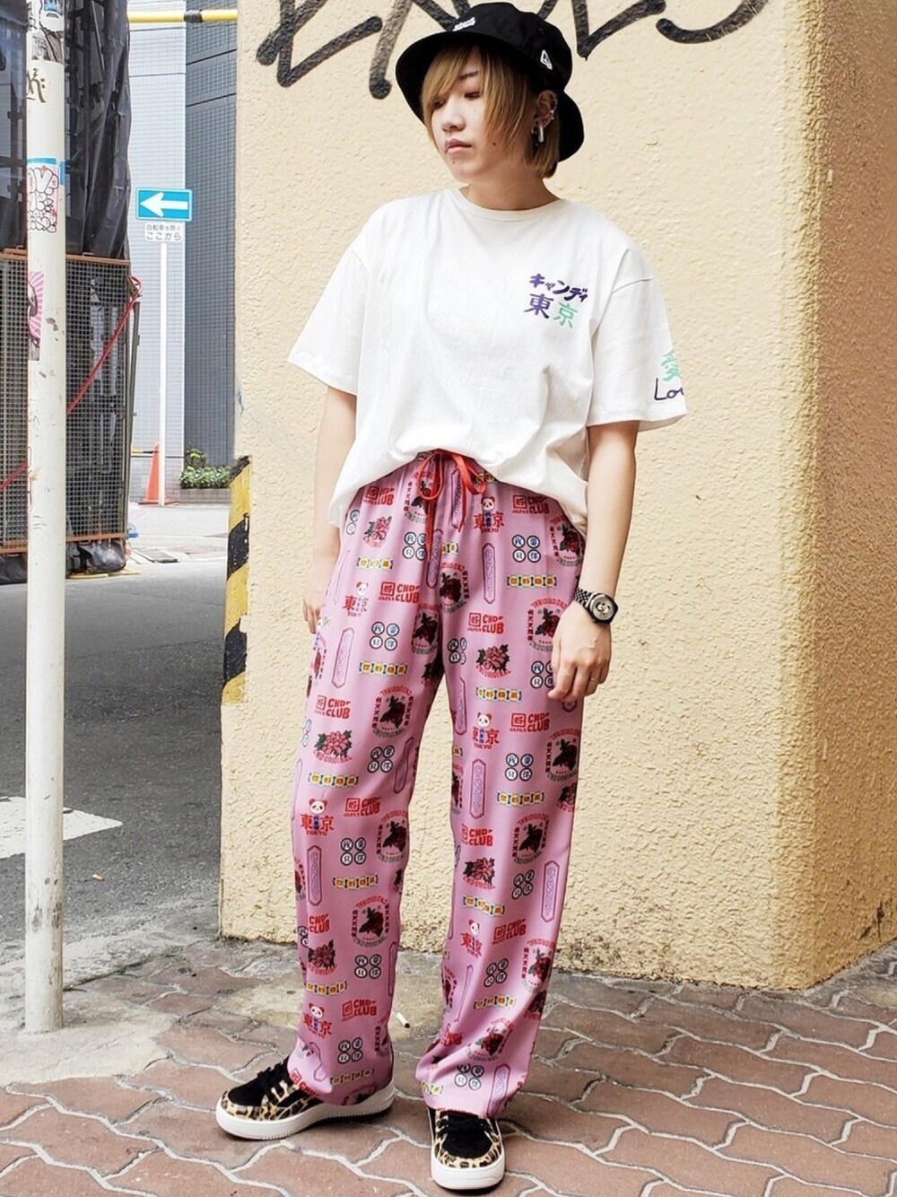オリエンタルなモチーフの総柄パンツにさわやかな白のTシャツを合わせたサマースタイル♪ バケットハットを被ってストリートなスタイルに。