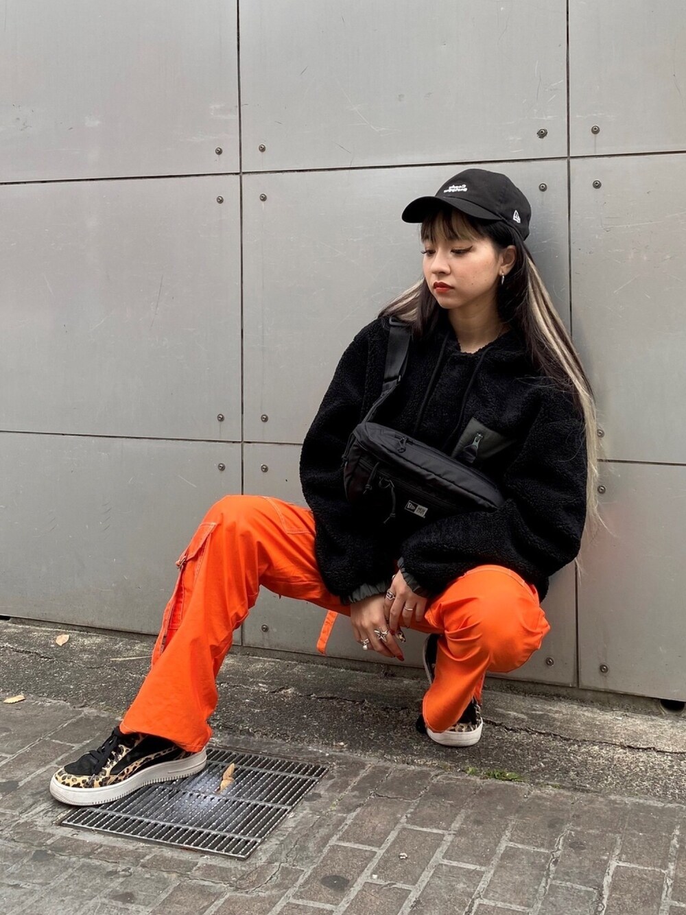 オレンジのカラーパンツにTOPと小物はブラックでまとめたストリートスタイル♡