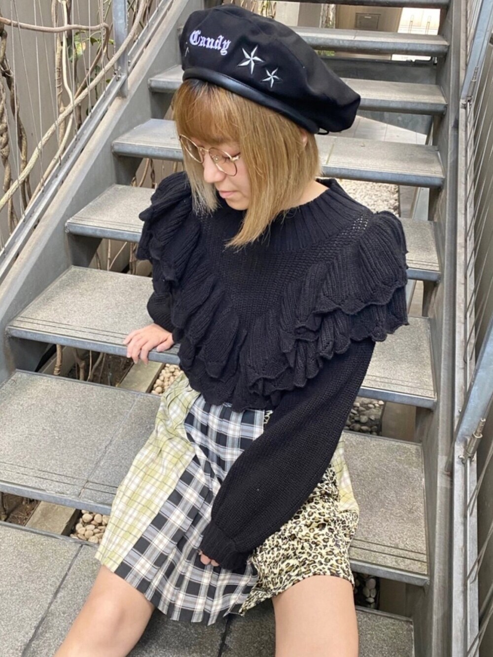フリルニットにミニスカートを合わせたガーリースタイル! ベレー帽はリバーシブルで、裏地はブラック×グリーンのチェックタイプ