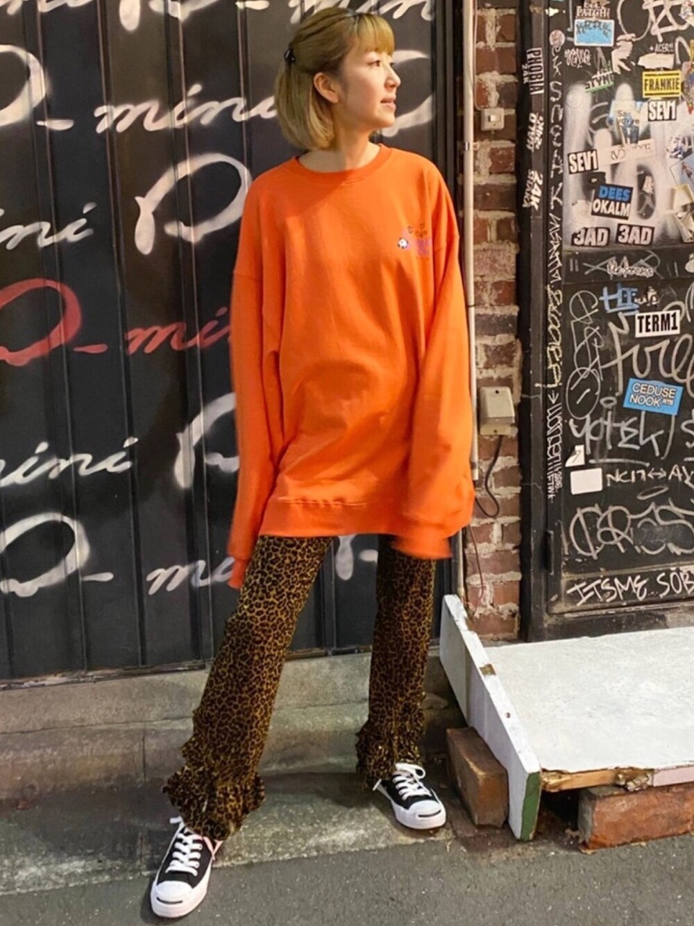 スウェットワンピをゆったりめのトップスとして着用出来る! レオパード柄のベロアパンツと合わせて、おしゃれストリートに。