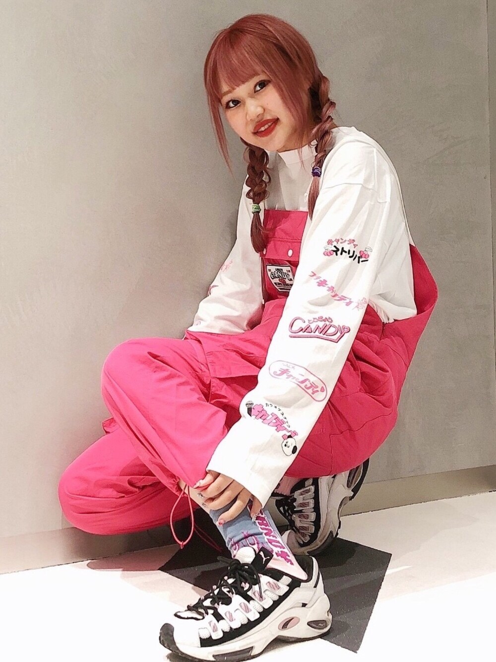 大きなカーゴポケットが目を惹く! ナイロンワークオーバーオールにスナックをイメージしたレトロなロゴのロンTを合わせた、 個性たっぷりなストリートスタイル♪