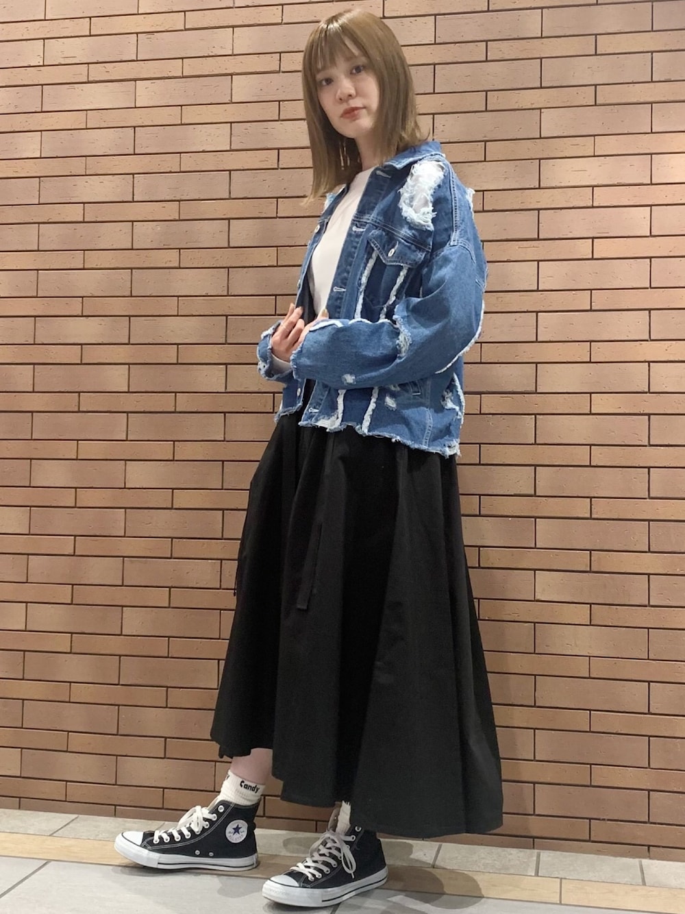 デザイン性の高いトレンドのデニムジャケットにフレアスカートを合わせた、カジュアルコーデ◎