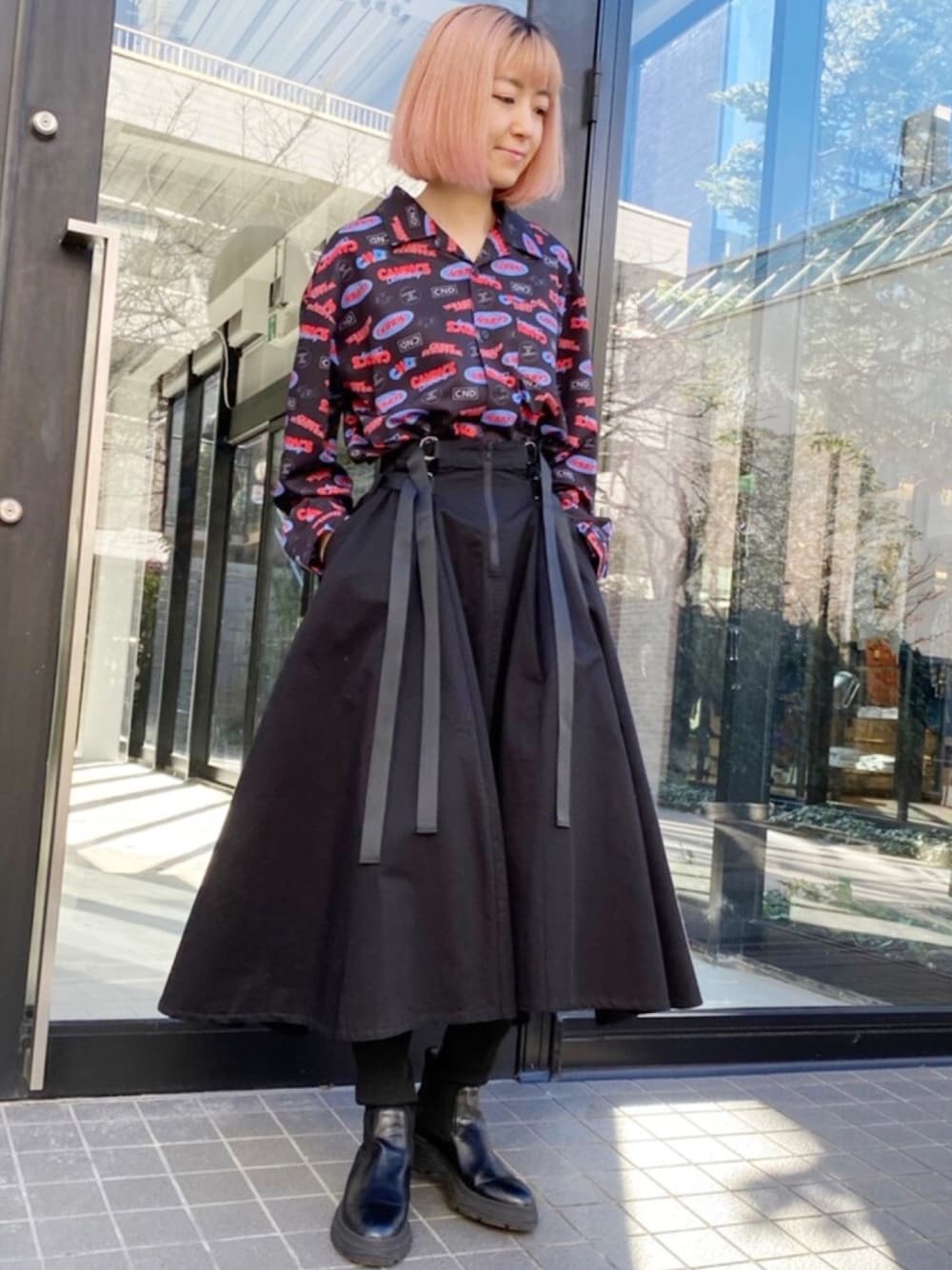 シルエットの綺麗なフレアスカートにオリジナルの総柄シャツをIN◎ 重くならないオールブラックコーデ!